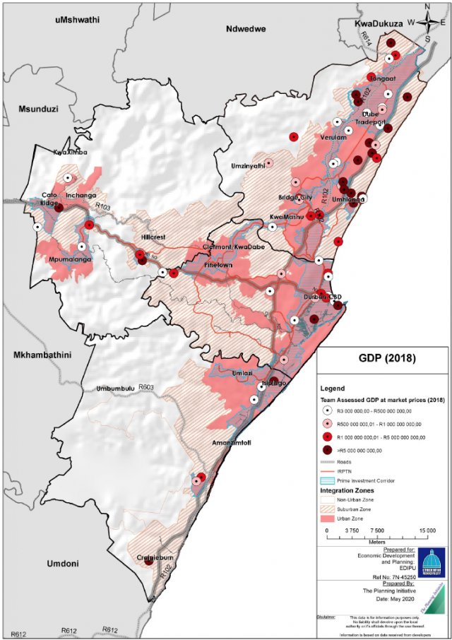 KZN regional multipliers were used in order to standardise the GDP, employment and tax information across the projects provided. In total, the projects included are expected to contribute approximately R300 billion to GDP, 1.3 million jobs, and R93 billion in taxes to the KwaZulu-Natal economy (of which more than half the impact would be felt within the eThekwini economy).